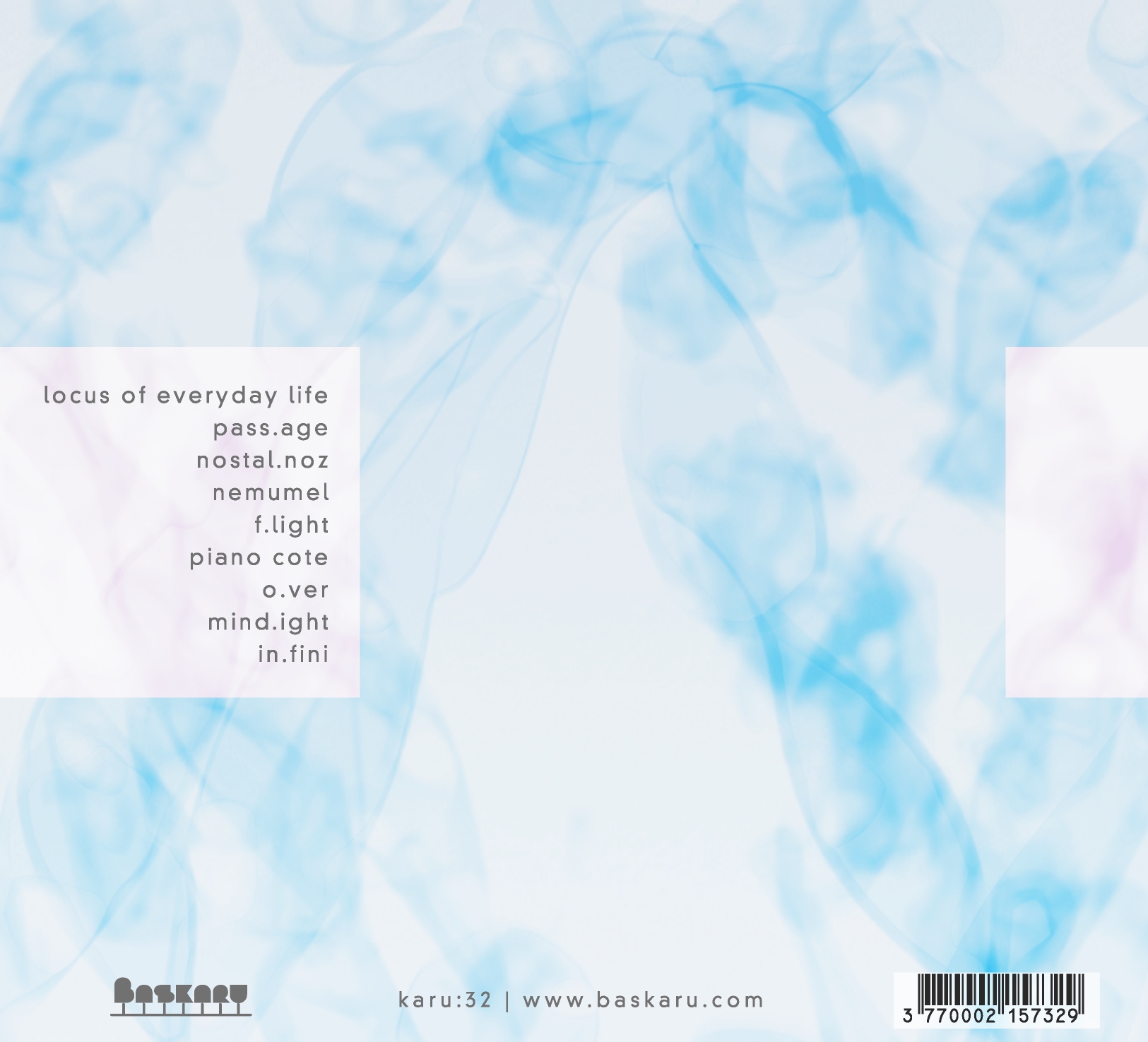 Sawako has released albums on the labels 12k, and/OAR, Anticipate, and now Baskaru. Her audio and visual works have been programmed around the world at such events and venues as the Sonar Festival, MUTEK, P.S.1/MoMA, UCLA Hammer Museum, Roulette, Resonance FM, and ICA London. nu.it's mastering was entrusted to Yu Miyashita, aka Yaporigami, who released material on Mille Plateaux, mAtter, Hz Records, and +MUS. The cover art is by kynd, whose ephemeral OpenFrameworks drawings have been featured by CreativeApplications.